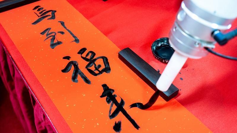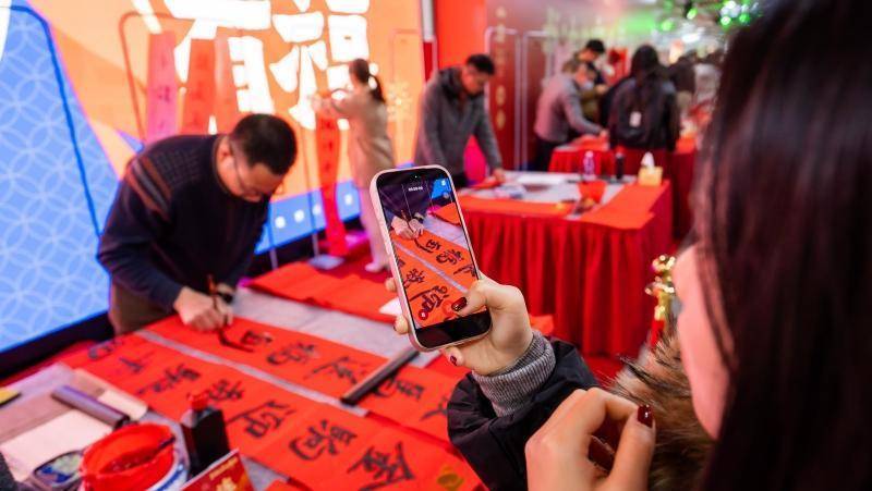 活动现场翰墨飘香,多位知名书法家挥毫泼墨,为市民书写新春祝福。智能书法机器人现场演示毛笔书写,数字化“写福机”则提供便捷的定制服务,市民可现场打印带有个人印记的专属“福”字。“传统+科技”的融合互动,让市民在领取祝福的同时,也能参与到互动之中,把这份“新潮”年味带回家。