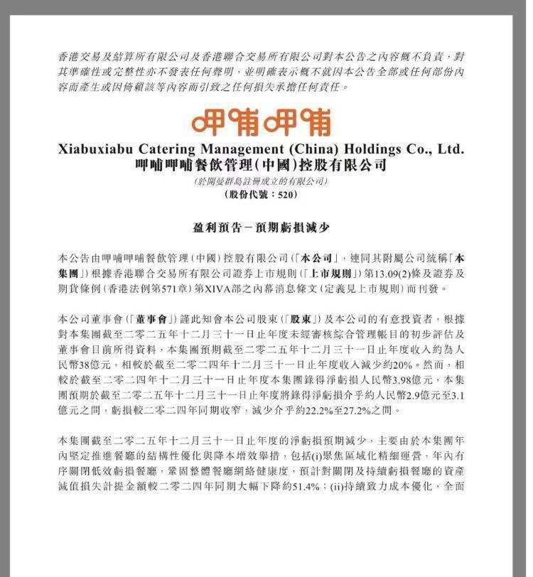 消息面上,3月6日晚,呷哺呷哺发布2025年度业绩预告。公告显示,公司预计本年度实现营业收入38亿元,同比减少约20%;营收规模持续萎缩,相较于2021年巅峰时期的61.47亿元,缩水幅度超38%。净利润方面,预计2025年继续亏损2.9亿元至3.1亿元,与上年同期亏损3.98亿元相比,减亏22.2%至27.2%。