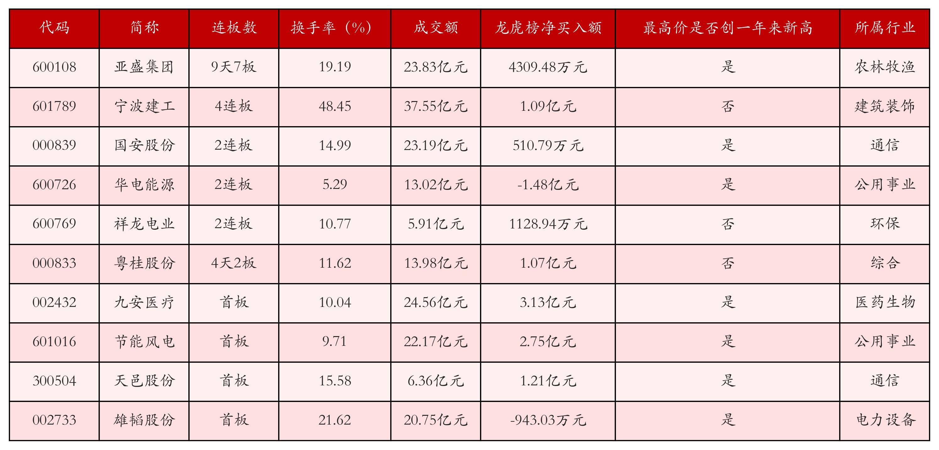 截至3月11日收盘,上证综指上涨0.25%,收于4133.43点,深证成指上涨0.78%,收于14465.41点,创业板指上涨1.31%,收于3349.53点。今日沪深两市A股共计67只涨停,综合当前连板数以及当日龙虎榜数据,其中较为强势的前三只个股分别为:亚盛集团(600108)、宁波建工(601789)与国安股份(000839)。今日强势个股前10位具体数据见下表: