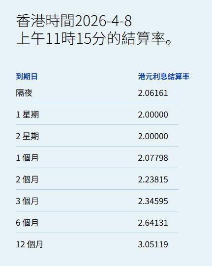 智通财经APP获悉,4月8日,港元拆息全线向上,隔夜息报2.06161%,升3.887基点;一周拆息升7.25基点配资门户官方网,报2%,两周则升12.559基点,报2%。与楼按相关的一个月拆息连升两日报2.07798%,升9.197基点。