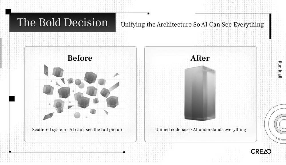 旧架构分散在多个独立系统中,一处修改可能需触碰3-4个仓库。人类工程师尚可管理,但对AI Agent而言,太不透明,无法推理跨服务的影响,也无法在本地运行集成测试。