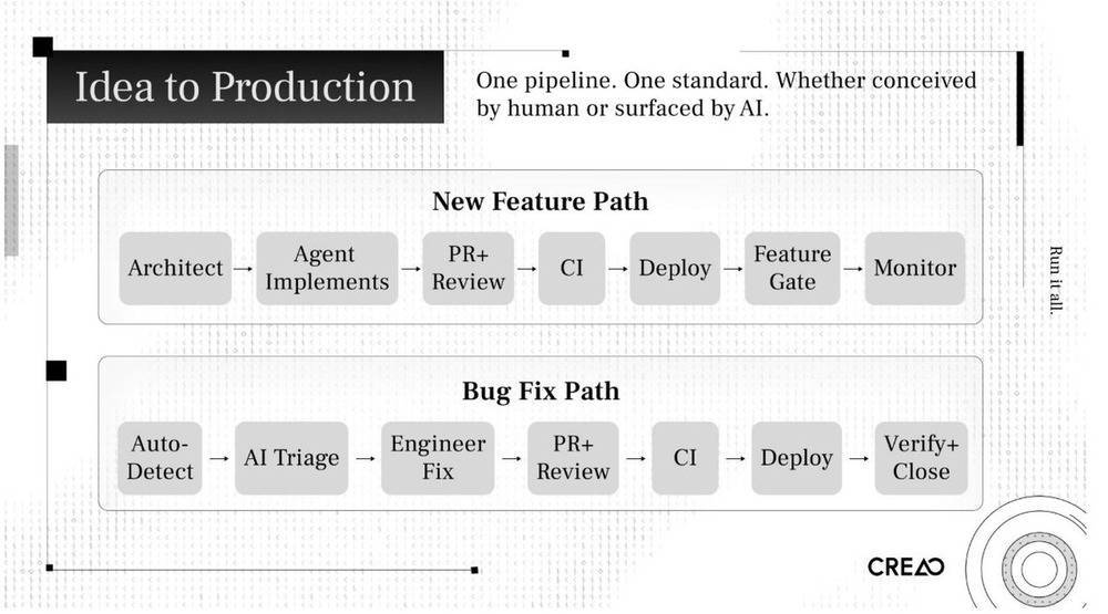 新功能流程架构师定义任务(结构化prompt + 代码库上下文、目标、约束)Agent分解任务、计划实现、写代码、生成测试PR打开,Claude三次审查,人类审查战略风险CI验证(类型检查、lint、单元/集成/端到端测试)Graphite merge queue重跑CI,合并通过六阶段部署流水线推进开发和生产环境的测试。功能门控为团队开启,逐步增加比例并监控指标。如有问题,可用关闭开关立即下线,严重问题触发熔断回滚。Bug修复路径CloudWatch和Sentry检测错误Claude分诊引擎评分,生成Linear任务工程师调查,AI已完成诊断,人工验证并提交修复走同一套严格的代码审查、验证、部署和监控流水线分诊引擎复核,任务解决自动关闭