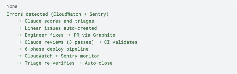 工程师推送修复,流水线同样处理,三次Claude审查、CI验证、六阶段部署,部署后分诊引擎重新检查CloudWatch,如原错误解决,Linear任务自动关闭。