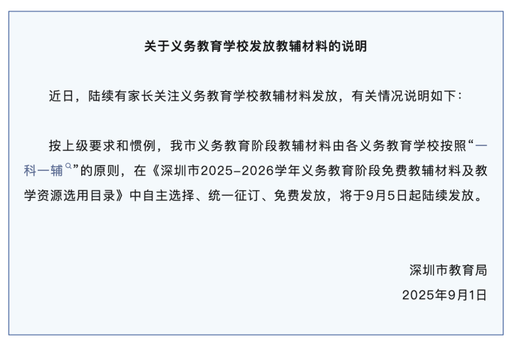 按上级要求和惯例,我市义务教育阶段教辅材料由各义务教育学校按照“一科一辅”的原则,在《深圳市2025-2026学年义务教育阶段免费教辅材料及教学资源选用目录》中自主选择、统一征订、免费发放,将于9月5日起陆续发放。