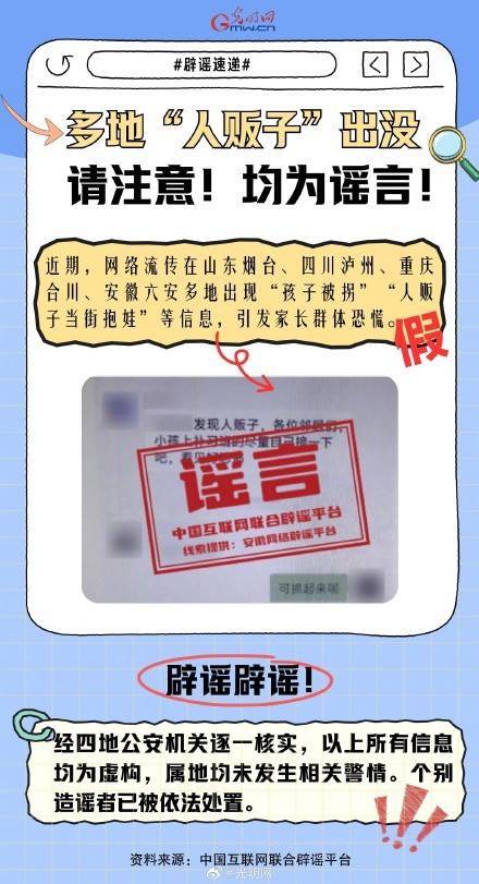 近期,网络流传在山东烟台、四川泸州、重庆合川、安徽六安多地出现“孩子被拐”“人贩子当街抱娃”等信息,引发家长群体恐慌。现在辟谣!经四地公安机关逐一核实,以上所有信息均为虚构,属地均未发生相关警情。个别造谣者已被依法处置。