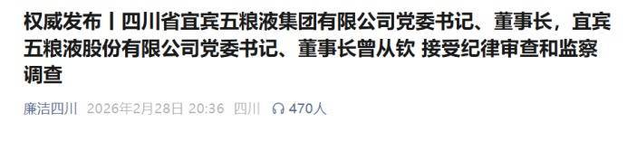 2月28日晚,五粮液发布公告称,已收到董事长曾从钦的《立案通知书》与宜宾市监察委员会出具的《留置通知书》,其因涉嫌严重违纪违法正接受纪律审查和监察调查,公司目前生产经营正常。