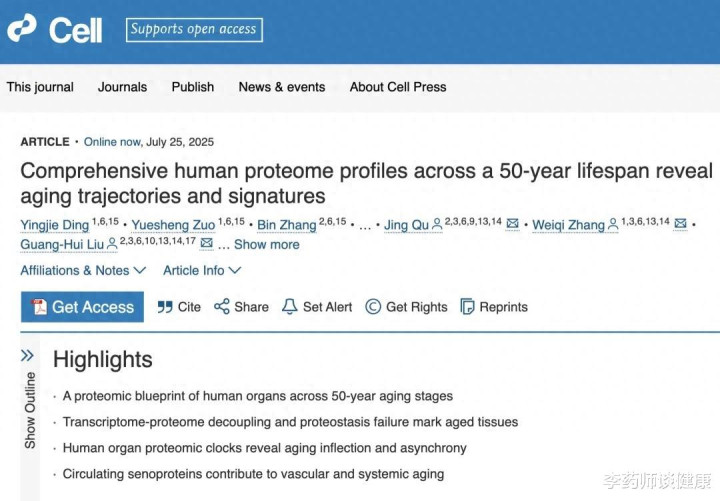 我们经常会探讨这样一个问题:人体的衰老过程是随着年龄增长线性出现的,还是会在某个年龄阶段出现“拐点”,出现加速衰老呢?一项有中国研究团队发表在顶尖期刊 Cell 上的重磅研究中,通过对人体跨越50年生命历程的蛋白质组进行全面分析,揭示了人体开始出现加速衰老的重要节点。
